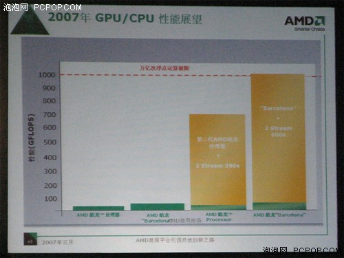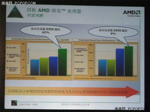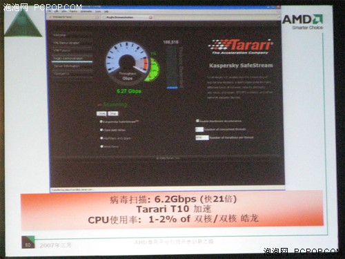 2007年3月28日,AMD在北京舉行創新技術趨勢大會。會上,來自AMD美國總部的高管與專家全面展示了AMD最新技術產品及解決方案,並且詳細闡釋了AMD的創新技術和發展趨勢。AMD服務器/工作站全球業務拓展經理John Fruehe,對即將發佈四核Barcelona處理器進行了詳細介紹。 AMD四核處理器在specfp_rate2000,比Intel目前最高端的Xeon 5355還要高42%。 ![]() 2x R600 over 1 teraflops ![]() kaspersky saftstream + Tarari T10 |