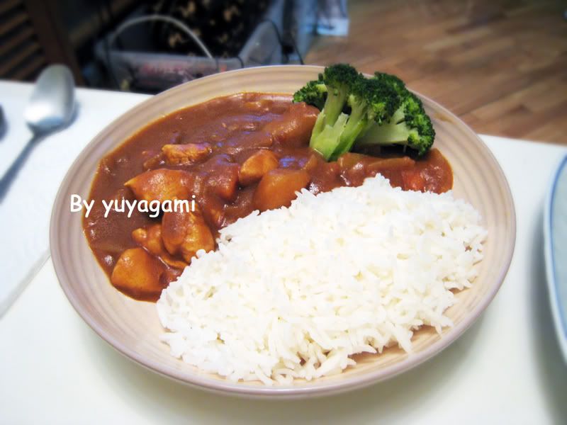 d)所有材料都鬆軟時再放入雞肉煮熟,再加入咖哩塊溶解完後美味的咖哩就完成了 ,放上少許花椰菜就漂亮上菜嚕!