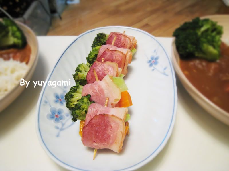 材料:紅蘿蔔少許、花椰菜少許、培根五條