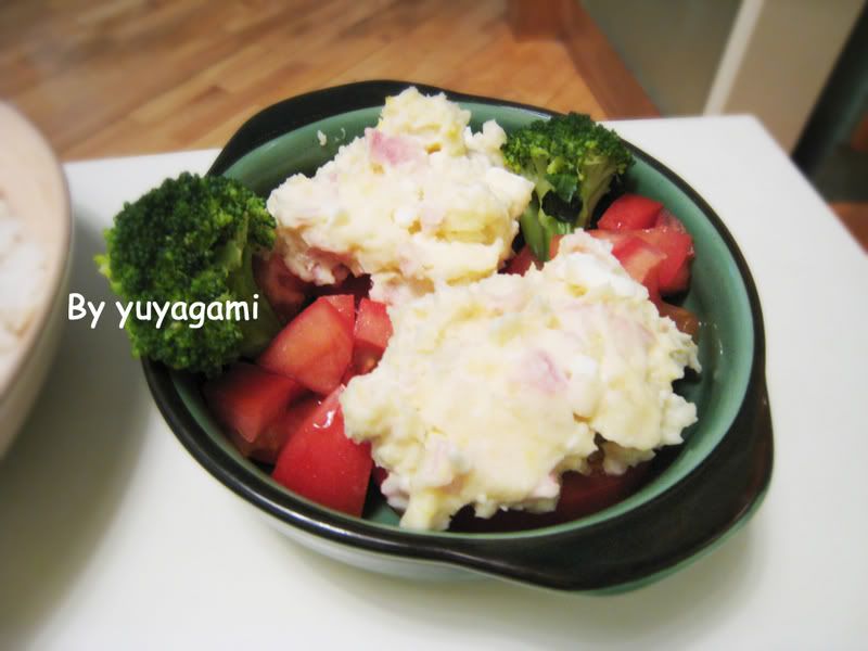 材料:馬鈴薯二顆、洋蔥半顆、水煮蛋二顆、美奶滋少許、火腿少許、蕃茄一顆、水煮花椰菜少許