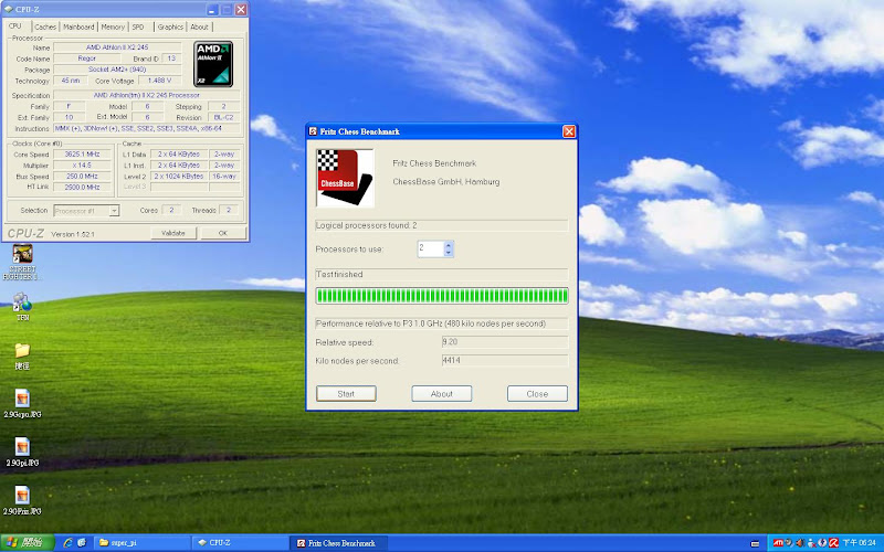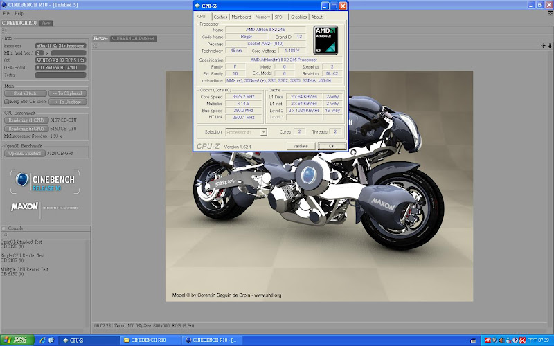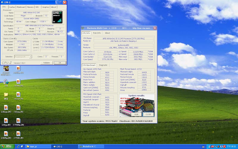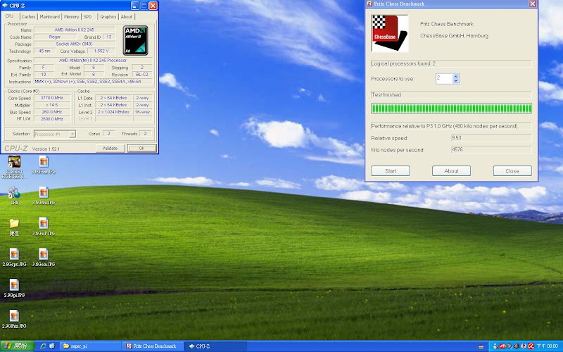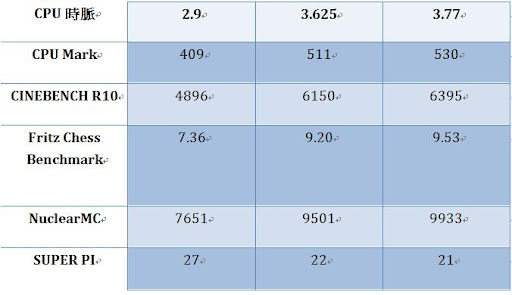 前陣子有看到某位超強板友分享的620超頻文,激起我的信心,既然620這麼耐超,我想我家的245應該也可以做得到!! 於是我就放膽下去開始了我的245改造之挑戰~~ 測試環境 : CPU : AMD Athlon II X2 245 主機板 : 技嘉 GA-785GM-UD2H 記憶體 : 創見 Jet ram DDR2 800 2G*2 硬碟 : WD 320G AAKS 電源 : Be Quiet 350W 顯示卡 : HD 4200 內顯 先來個預設數值200 * 14.5 =2.9GHz看看,發現這數值跟網路上的Athlon II X2 250數據機乎沒差多少。 你以為這顆CPU就只有這樣嗎?那你就錯了,外頻直接上250,來試試看250 * 14.5 = 3.625 GHz。我的運氣還不錯,買到的245似乎還蠻強壯的。 就像閃電霹靂車裡風間所說的 : “今天的我沒有極限”,沒錯,當你以為走到路盡頭,其實柳暗花明又一村,可愛的外頻總是會出乎你的意料之外。 直接飆上3.8G 來跑CineBench 後來經過測試 發現3.77G才是這顆245最穩的時脈!! 這一連串的測試下來,弄得我眼花撩亂,搞一張圖表來總整理 結論 : 這顆還是我認識的245嗎?連我自己都不敢相信了,便宜的CPU也有出頭天的時候,想不到245也這麼能超,慶X林董的介紹果然沒錯,俗又大碗,超到3.8G的時候,原本對這顆CPU不存在期望的我嚇了一跳,誰說便宜的入門裝機CPU就不能玩超頻XD。