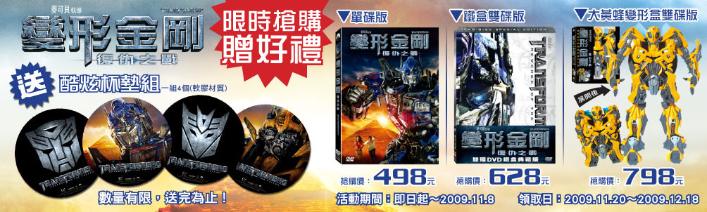 台灣2009票房冠軍【變形金剛:復仇之戰】DVD 10/21展開預購 隨著2009年終將盡,本年度台灣的電影票房冠軍也即將出爐,今年暑假在全球引爆熱潮的續集電影【變形金剛:復仇之戰】幾乎已篤定成為今年度台灣的電影票房冠軍。本片大台北地區累計總票房高達兩億四千多萬,比起兩年前第一集的一億八千多萬還更上一層樓!至今【變形金剛:復仇之戰】的IMAX版還在戲院上映當中,而DVD已確定將在11月發行,預購活動也將在10月21日起熱烈展開,勢必將這股熱潮持續延燒到2009年底! 。【變形金剛:復仇之戰】的DVD針對不同消費者的需求也推出不同的版本,這次展開預購的除了一般的單碟版之外,還包括兩款全球限量推出的雙碟版,分別是『大黃蜂變形盒雙碟版』以及『鐵盒雙碟版』。大黃蜂變形盒就如同當初第一集DVD發行時推出的柯博文變形盒類似�***盒本身除了收納碟片之外,還可變形為可站立的變形金剛;至於這次第二集的鐵盒版,圖案則是以白底為主,再配上柯博文的半邊臉,絕對是影迷收藏的首選。這兩個雙碟版除了普通版的電影正片之外,第二碟更收錄了豐富的獨家內容,包括本片的製作日誌、拍攝花絮、訪談,還有介紹變形金剛的歷史,以及一些被刪掉以及新增的片段。 預購【變形金剛:復仇之戰】DVD以上任一版本的消費者,除了享有九折預購優惠價之外,還可免費獲得一套預購獨享的贈品『變形金剛酷炫杯墊組』,此杯墊組共包含四個不同圖案的軟膠材質杯墊,分別是柯博文、大黃蜂以及博派、狂派的標誌,限量供應,送完為止。 此一【變形金剛:復仇之戰】DVD預購活動定於10月21日開始;於11月8日截止,DVD及贈品則於11月20日起開始於原購買店家領取(【變形金剛:復仇之戰】雙碟鐵盒版開始取貨時間為11/27)。預購的地點包括有全台灣的7-11便利超商、亞藝影音、百視達、法雅客、海山、各大DVD商店及唱片行,以及博客來、PChome等網路商店。 這邊可以看到詳細的產品圖和預購消息: http://tinyurl.com/ykgmxtx ![]() 此文章於 2009-10-24 08:26 AM 被 KIMHO 編輯. |