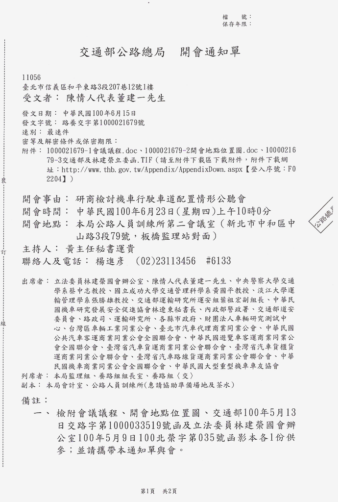 公路總局已正式通知機車黨這邊,訂於民國100年6月23日(四),上午10:00,於公路總局公路人員訓練所,召開【研商檢討機車行駛車道配置情形公聽會】