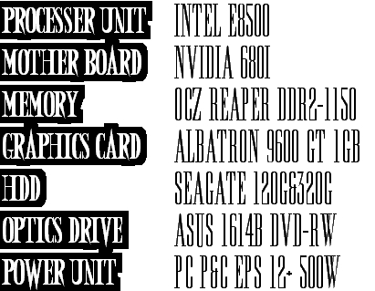 CPU:AM2 Athlon 64 X2 4000+(65W)/MB:ASUS M2N-MX SE PLUS/RAM:UMAX DDR2 800 1G*2/VGA:Cahintech GF7300LE 128MB/HD:SEAGATE 160G+WD 640G/DVD-RW:MSI 20X DVD-RAM/POWER:AcBel E2 340W/CASE:COOBEEO APPLE/MONITOR:AOC 210S 22"LCD NB:acer Aspire one AO532h 10.1" Intel Atom N450/2G/250G |