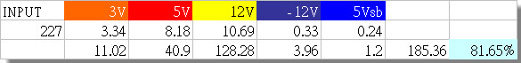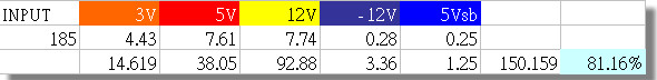 ![]() 測試工具:變電家電源監視器,數位鉤錶。 測試條件: ![]() 這是世界最亂的測試平台。 ![]() CPU-Z的CPU超頻狀態。 ![]() CPU-Z的記憶體狀態 CPU ->OC FSB 2000 mhz x 8 MEMORY -> OC 1142 mhz 5-5-5-15 VGA ->OC Core-750 / GDDR3-1000 / Shader-2000 CPU Volt ->1.264v MEMORY Volt ->2.1v NB Volt ->1.5v NFORCE SPP ->1.5v ![]() 這是待機10分鐘穩定狀態,此時輸出才約37%的功率。 ![]() 此時的PF值0.99。 ![]() 接下來測試跑3DMARK 06 SM3.0無限迴圈,燒機約半小時後來進行Full Loading測試。 ![]() Full Loading下的狀態,此時為45%功率輸出。 ![]() 達到完美轉換因數PF值1.00。 ![]() 這是37% Loading狀態下的轉換功率,已經達到81%。 ![]() 這是45%Loading狀態下的轉換功率,非常穩定的在82% 最後結論: 測試完整個對它超高穩定性感到訝異,本以為500W這種檔次應該用料會偷上許多,沒想到打開潘多拉的盒子後才能發現寶物,如此穩定的輸出即使是不太準確的鉤錶還能測出漂亮的成績,實在不簡單。 Thanks for your advice ! |