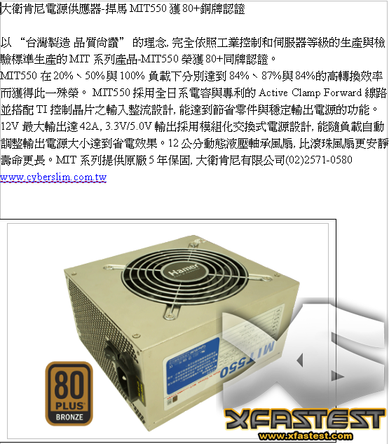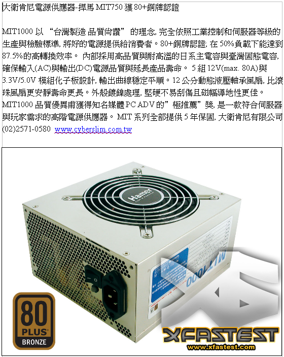 來源︰代理商 大衛肯尼官方新聞稿 ![]() ![]() ![]() 台灣市場零售通路建議售價 Hamer MIT1000︰ $13000 Hamer MIT750︰ $5900 Hamer MIT550︰ $4200 Hamer MIT450︰ :$3200 ( MIT450將於 8 月下旬提供) ========================================================= Hamer MIT 電源供應器 “台灣製造 品質尚讚” 的理念, 完全依照工業控制和伺服器等級的生產與檢驗標準, 將好的電源提供給消費者。 80+銅牌認證; 在50%負載下能達到87.5%的高轉換效率。 內部採用高品質與耐高溫的日系主電容與臺灣固態電容, 確保輸入(AC)與輸出(DC)電源品質與延長產品壽命。 5組12V(max. 80A)與3.3V/5.0V模組化子板設計, 輸出曲線穩定平順。 12公分動態液壓軸承風扇, 比滾珠風扇更安靜壽命更長。外殼鍍鎳處理, 堅硬不易刮傷且磁幅導地性更佳。 MIT系列全部提供5年保固, 大衛肯尼有限公司(02)2571-0580 www.cyberslim.com.tw ========================================================= 港都狼大的測試 http://forum.pcdvd.com.tw/showthread.php?t=863628
