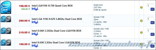 雖說Intel 32nm Clarkdale還要等到明年初才會發佈 不過偷跑是時有發生的,除了之前多次曝光過的Clarkdale的測試外 這次甚至有一家法國購物網站把Clarkdale擺上了貨架。 擺上架的Clarkdale處理器有三個型號,分別為Core i5-670/660/650 均為雙核心四線程,頻率為3.46/3.33/3.20GHz,具備4MB的L3緩存 CPU部分採用32nm工藝,不過圖形核心方面則繼續採用45nm。 所謂物以稀為貴,這三款處理器的售價均比之前曝光的Clarkdale處理器 價格資訊高不少,Core i5-670/660/650報價為299.95/219.95/199.95歐元 折合人民幣2904/2130/1936元。 ![]() 圖片來自:caseandcooling.fr[/B]