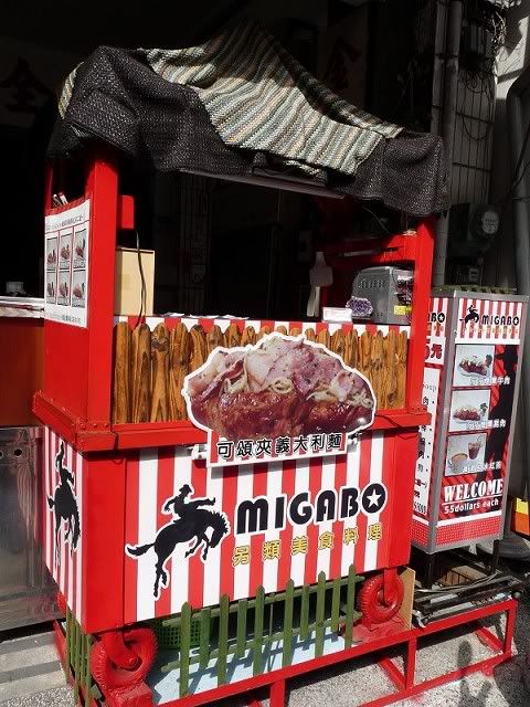 在民族路上,有一個顯眼的紅色攤子,主打的是很少見的,可頌麵包夾意大利麵。