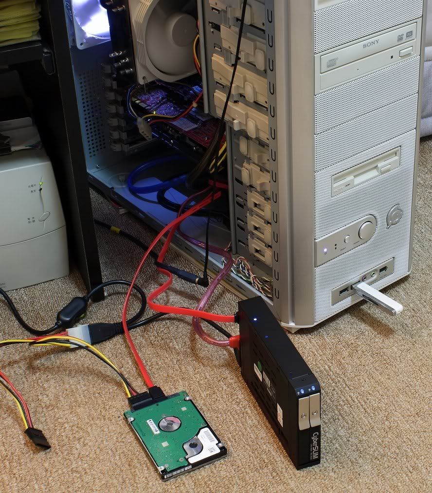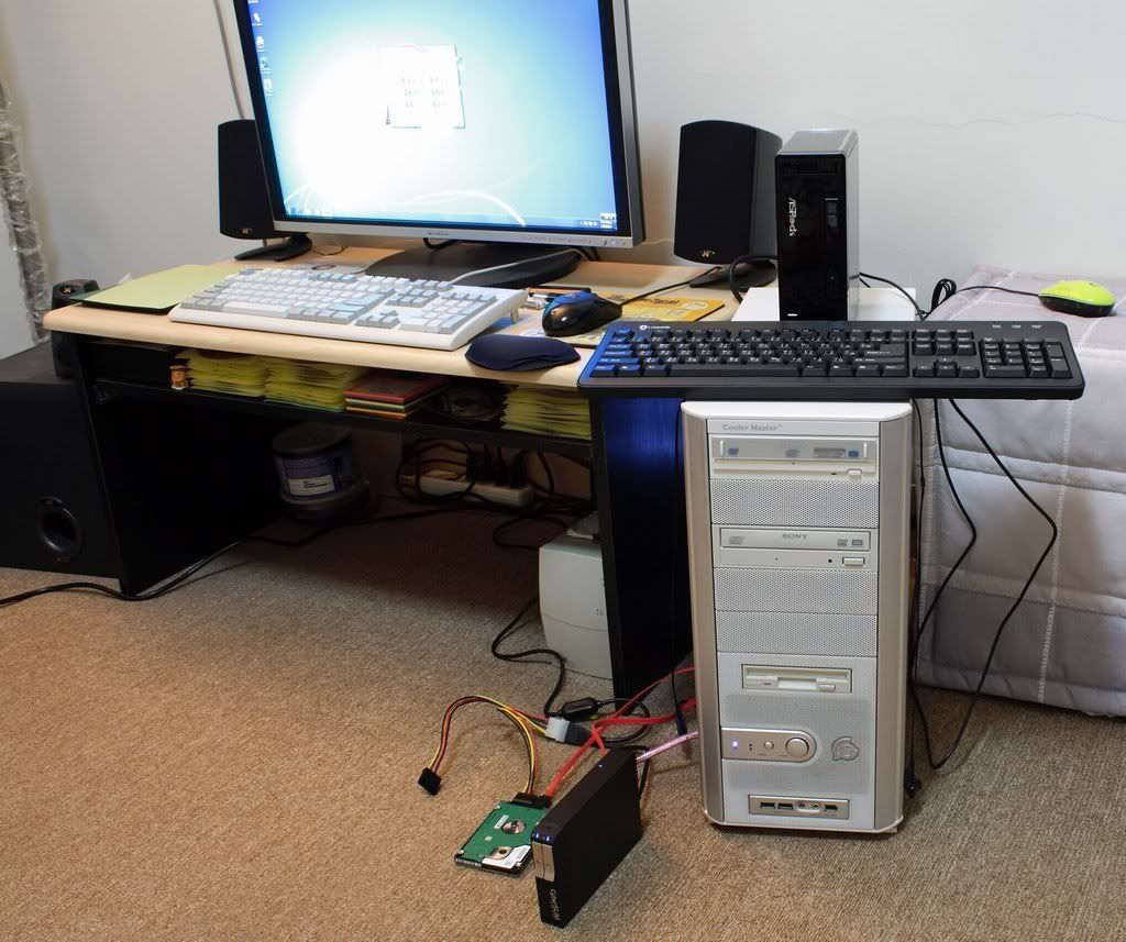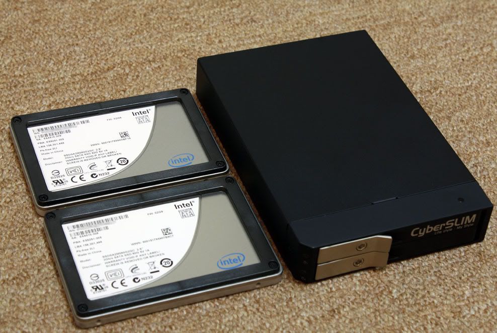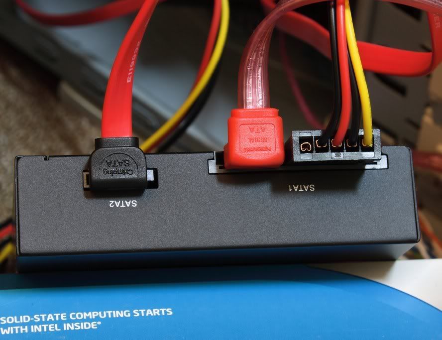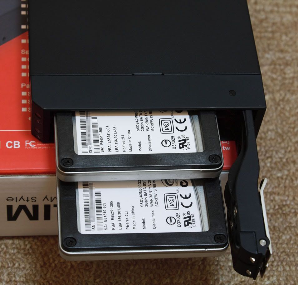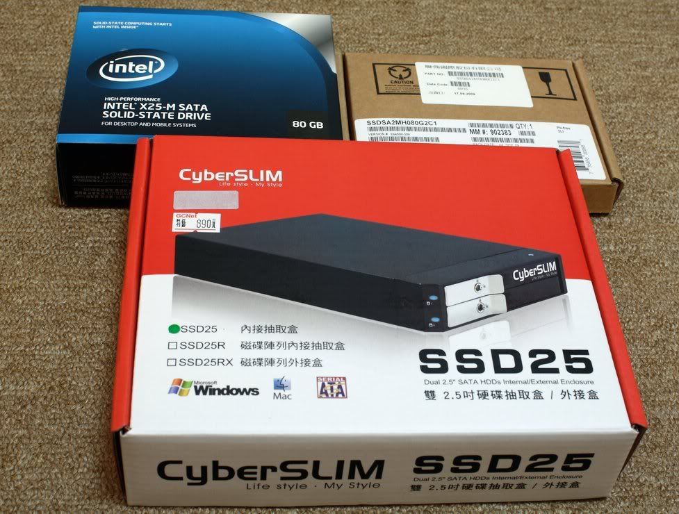 http://www.pcdvd.com.tw/showthread....D6+%AA%D6%A5%A7 剛巧該文章有人提到,如果不用它的內建RAID功能, 可否退而求其次改當作 SSD to 3.5 吋硬碟轉接盒, 且直接就接 Intel ICH9/9R/10 的 RAID 而不要產品的弱弱 RAID(受限單路 SATA2) 敝人查了一下,該大衛公司居然還真的有這類產品: 『SSD25 雙 2.5 吋硬碟抽取盒』 單純只是轉接,提供安裝設備或機殼內整線時的方便, 而且,當然可轉用 Intel ICH9/9R/10 的 RAID。 於是乎就跑去光華搞了一咖這個傢伙回家玩..... 先和其他伙伴一起合照吧! ![]() 開盒後..... ![]() 組合中的畫面 ![]() 極端簡便的組裝好後,本想直接放在機殼頂上測試.... ![]() 背後還有一個前不久入手的BT機兼放片機,不過版上已經有開箱文, 所以不再加以敘述了.....(效能很可憐,但 ATOM-330 本來就只有這點修為...) ![]() 插花幾張測試時的室內環境,至於旁邊那顆 2.5 HDD,另有用途..... ![]() ![]() 接線連接的實際情形,需要 2 條 SATA 排線 & 1 條 電源線(省用一條方便又利於整線) ![]() 待續....
