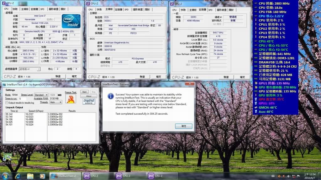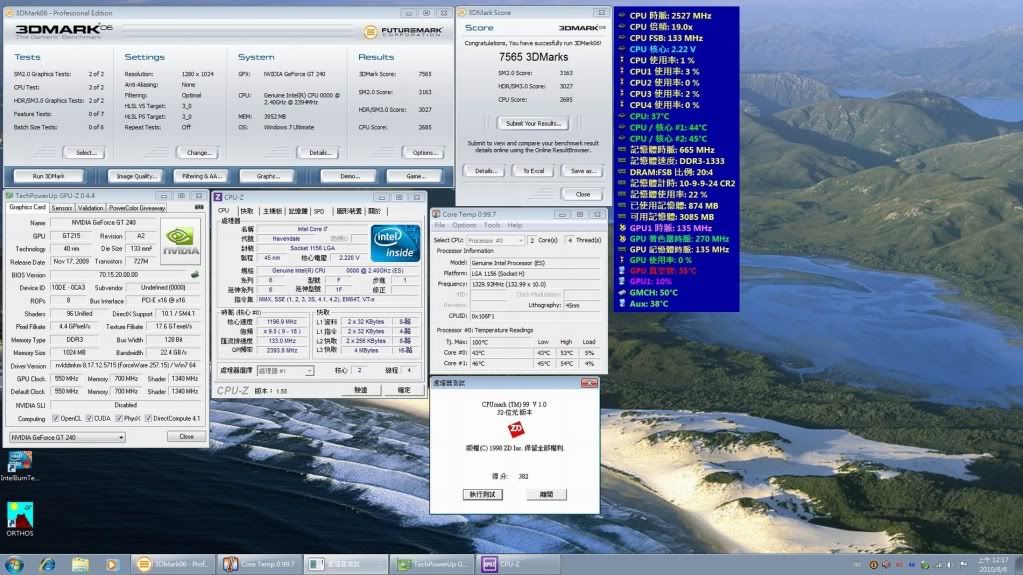 接下來是先用裸機測試~! CPU預設值~待機功耗49W ![]() CPU預設值~燒機功耗89W ![]() ---------------------------------------------------------------------------------- 裝上精英的GTS240後功耗62W ![]() 精英的GTS240跑3D06-最高功耗67W ![]() CPU未超頻跑GTS2403D06分數~7565 ![]() ---------------------------------------------------------------------------------- CPU超上2.8G-待機-功耗59W ![]() CPU超上2.8G-燒機-功耗97W ![]() 超上2.8G~IBT燒機OK ![]() CPU超上2.8G-上GTS240待機-功耗67W ![]() CPU超上2.8G-上GTS240跑3D06-功耗116W ![]() CPU超上2.8G-GTS240跑3D06分數~7737 ![]()