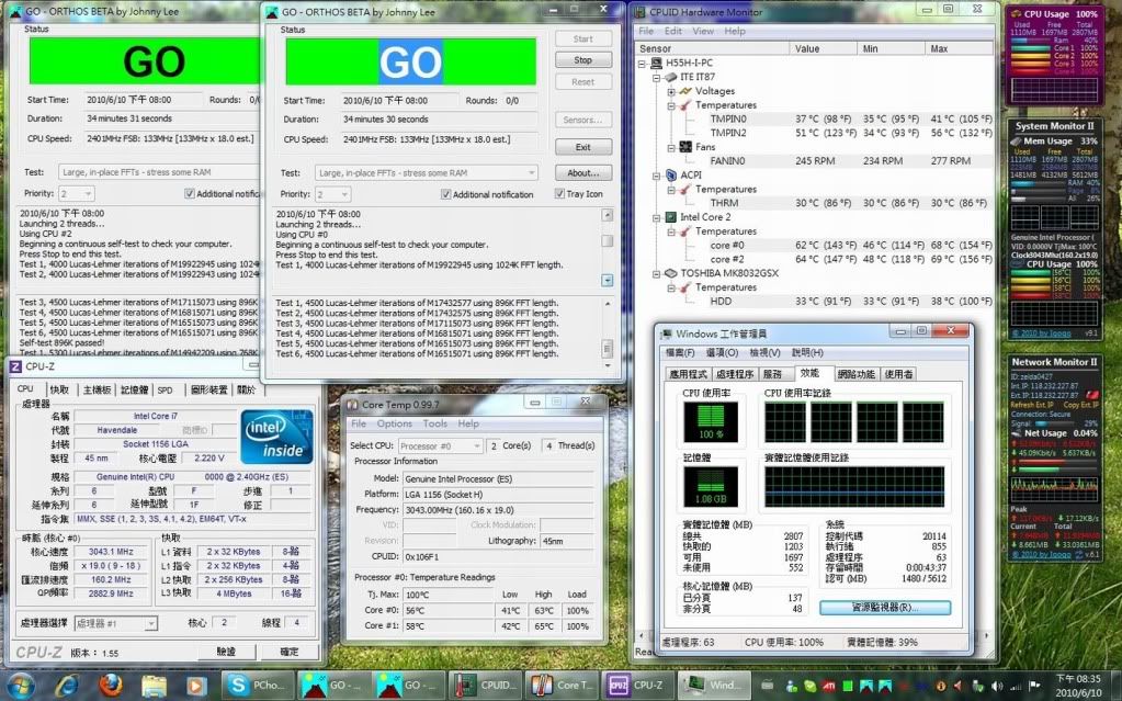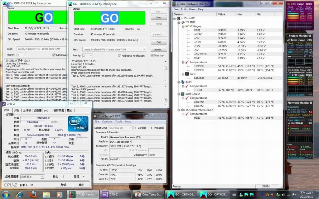 和H55H-I的盒子差不多大~~! ![]() 散熱器的高度~! ![]() 鎖上主機板後~感覺很小吧~! ![]() 鎖完後~主機板也不會板彎~! ![]() 可以剛好閃過記憶体~! ![]() ![]() ![]() 上風扇嘍~風扇是用2800轉的ADDA扇~~! ![]() 裝上機殼嘍~!剛剛好可以全部閃過~真是可愛的散熱器~! ![]() 先來看一看原廠的散熱器燒機後的溫度~! ![]() 在來看看小牧童散熱器的燒機溫度~! ![]() 結語~! 未裝小牧童時~原廠散熱器燒機約80度左右~! 而裝上了小牧童散熱器後~燒機溫度約62~65度左右~! 下降的幅度真不少~! 果真是可愛又小的散熱器~! 拿來裝在HTPC~ITX機殼上真是絕配~~!