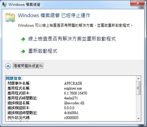 ![]() 自從灌了windows7出現開啟某些檔案或有該檔的資料夾就會出現[檔案總管發生錯誤關閉]