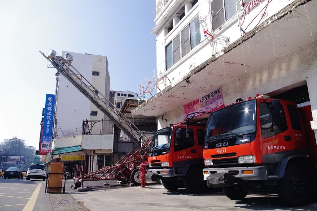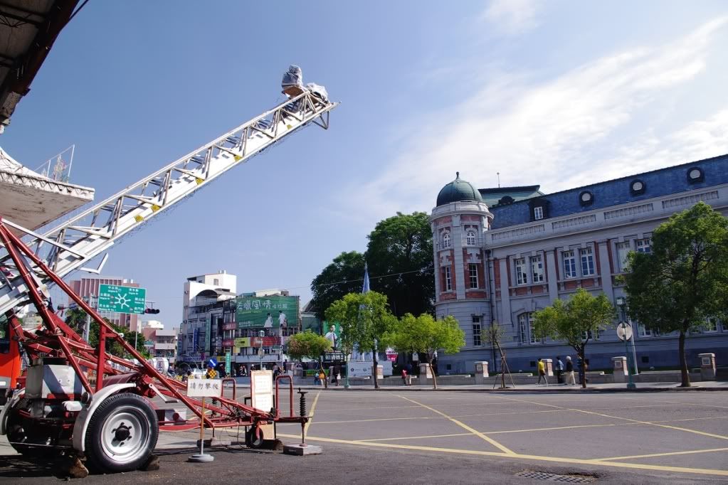 雲梯車像伸長脖子,貪看著文學館上的白雲。