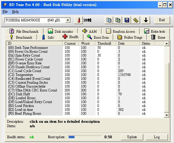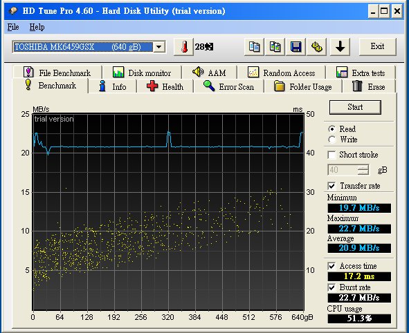 真是的,這麼晚還送貨喔。請他今天再送過來。 今天一早就收到貨了。 http://shopping.pchome.com.tw/?mod=...=DRAA0J&ROWNO=6 Imation SOHOT PRO 640GB ![]() 為甚麼挑這個,只能說小弟是"外貿協會" <- 看對眼。 有送諾頓防毒與PIZZ券,這些小弟都用不上。 ![]() 第一印象就是好小好輕,送的USB線好短。 ![]() 安裝很簡單,一接上筆電就OK可以使用。 看了一下規格,硬碟是Toshiba MK6459GSX Benchmark:平均 20.9 MB/s ![]() Health:OK ![]() 報告完畢。