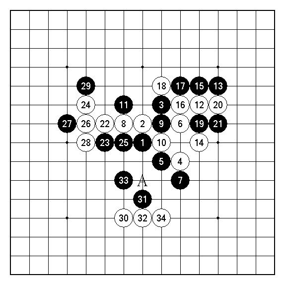 黑19、21意在阻礙白型。黑23開始利用一連串的先手對白棋施壓。