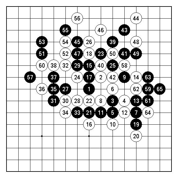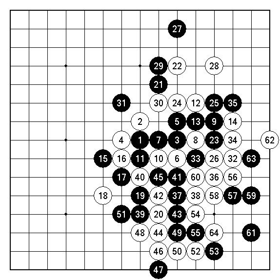 途中,白28改貼在29位,而白42改於43位蓋衝更能有效限縮黑陣。