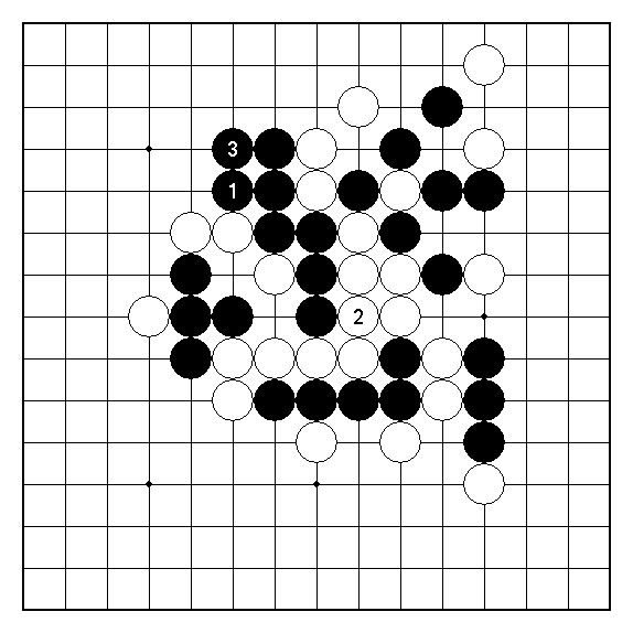 例題3︰實戰黑51改於本圖黑1、3團子整備,形成對白棋而言也是相當頭痛的攻擊陣勢。請在此找出白的唯一防點。
