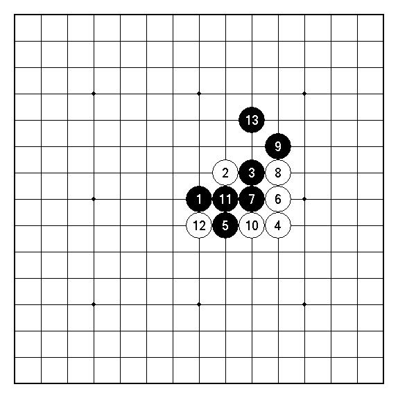 黑9為相當沉穩的等著,玩不出什麼花樣的白棋只好於下方白10碰問黑應手。