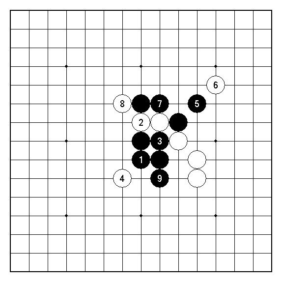 圖3︰續圖2。白2∼8皆是唯一防守,但黑9整備後白棋依舊束手無策。