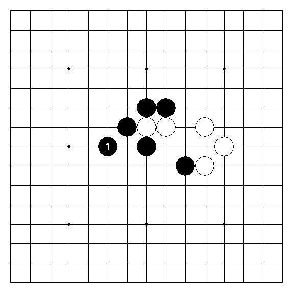 例題4︰實戰黑11改於本圖斜向活三的變化。試問白棋該如何對黑1的失著予以痛擊?