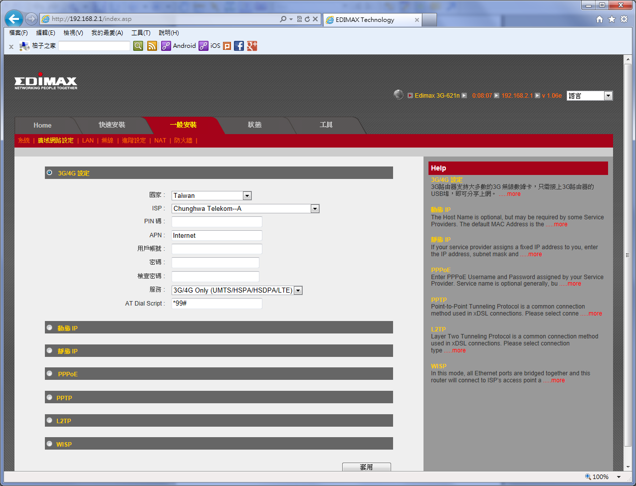 所以一台無線分享器很重要,可以支援3G就太棒了,隨時隨地手上的所有3C產品都能連上網路。 EDiMAX 3G-6218n,只要有網路就能上,而且還支援iPhone。 內建鋰電池 支援xDSL、3G(UMTS/HSDPA/HSPA/HSUPA/EVDO/CDMA)、Cable、WISP上網 支援3G網卡,也支援iPhone的3G分享。 包裝內容有分享器一台、鋰電池、網路線、安裝指南、光碟片、電源變壓器。 包裝背面列出了幾個主要功能 支援各家電信公司,除了台灣的電信商還有中國及香港的電信服務商。 對於兩岸跑的台商也非常適合。 支援多種上網方式,還有備援,這是當一方網路斷線的時候,能夠確保網路是保持連線的狀態。 開箱了!裡面有產品保固卡、分享器一台、鋰電池、網路線、安裝指南、光碟片、電源變壓器,還有包裝上沒提到的USB延長線一條。 來看看分享器本體,正面有五個指示燈號。 從上到下是電源、充電、無線網路、Ethernet和網際網路。 左邊有LAN/WAN切換開關、WPS按鈕及電源開關。 另外一邊是充電孔和RJ-45網路埠。 在分享器的頂端是USB孔,提供3G網卡及連接iPhone,分享3G的網路來使用。 電池容量為1880mAh,官方數據為待機8小時,連接一般網卡連續使用3小時,如果連接iPhone則可以連續使用1.5小時。 電池背面是注意事項,產地在台灣。 --------------- 設定步驟 --------------- 預設帳號密碼為admin/1234 將分享器開關切換到「LAN」,使用網路線連接電腦,開啟瀏覽器在網址輸入「192.168.2.1」之後會跳出認證視窗,請輸入admin/1234。 ![]() 右上角有多國的語言切換,選擇繁體中文,操作起來會比較容易點。 ![]() 然後點「快速安裝」,設定時區選擇「(GMT+08:00)Taipei」,選擇完成後按「下一個」。 ![]() 選擇Internet連線模式,依照業者連線模式做選擇。 ![]() 設定完成並按下確定後,會出現儲存成功,請按APPLY重新啟動套用變更的設定。 ![]() 網頁會開始倒數100秒鐘,時間到了之後按下OK回到設定畫面。 ![]() 接者點一般安裝底下的無線,選擇波段、無線網路顯示名稱(SSID)。 ![]() 設定無線網路的頻道。設定完畢後按下套用儲存變更。 ![]() 按下左邊的繼續,可以繼續其他的設定;右邊的接受儲存設定變更並重新啟動分享器。 ![]() 剛剛只設定了無線網路,但是還沒有加密,這會讓無線網路被盜連,所以在安全設定的部分選擇加密方式,不過要注意手上設備是否支援較新的加密方式。 ![]() 一般安裝底下的進階設定可以設定Qos,控管網路頻寬。 ![]() 因為支援3G網卡及iPhone的3G分享,最底下也可以設定流量限制,避免3G爆量。計算方式以月分為單位。 ![]() 狀態底下的系統部分可以看到機型(翻譯成模型好像怪怪的)、時間、韌體版本等資訊。 ![]() 而狀態底下的設備狀態會顯示無線網路的設定和網路設定。 ![]() 工具的地方可以將目前的設定備份及還原或是重設到出廠值。以上是無線網路設定。 --------------- 3G網卡分享 --------------- ![]() ![]() 如果要設定3G網卡則到一般安裝底下的「廣域網路設定」,選擇國家、3G電信服務商,APN一般設定為Internet。(如果電信商選擇中華預設會是emome) ![]() 撥號輸入「*99#」,輸入完成後別忘記按下套用來儲存變更。 同步發表於部落格