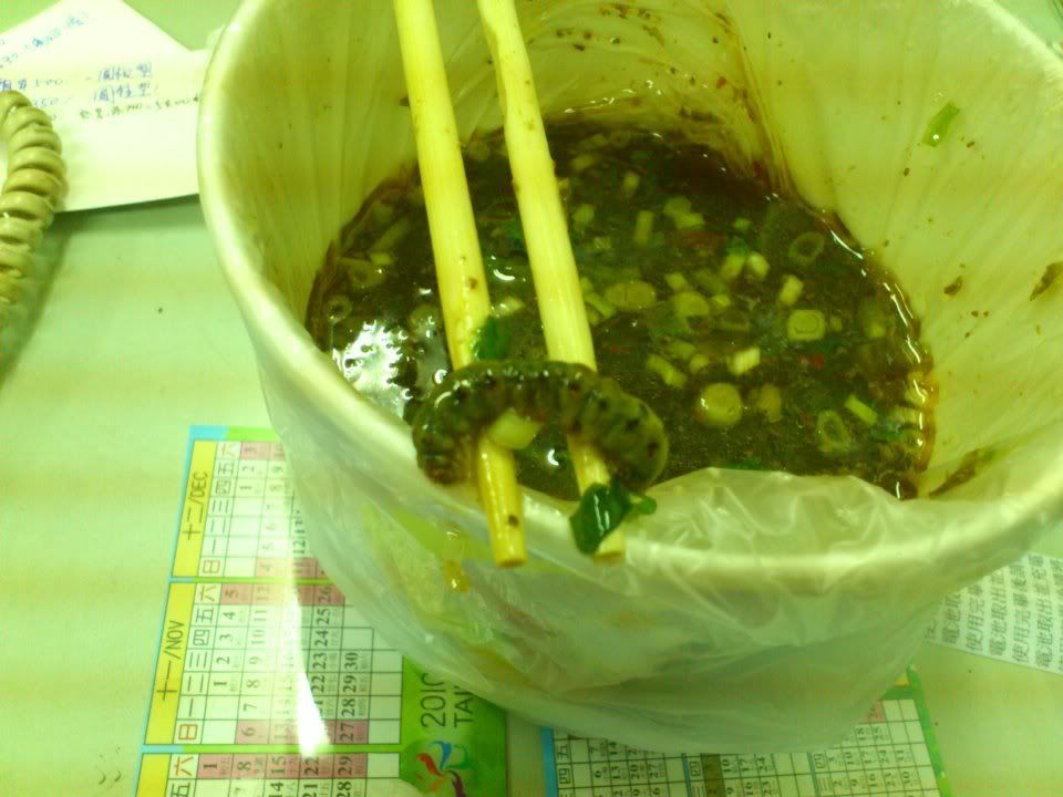 ![]() 吃到快完了,才撈到又肥又大的菜蟲,店家是士林區芝山岩附近有名的麵店 拿去店家給老闆看,老闆說不然給你換一碗,我選擇退錢了...... 同事譏笑說好補喔~~ |