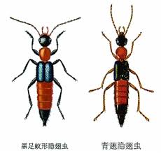長得有點像隱翅蟲,屁股則不像∼google借來的圖: http://t1.gstatic.com/images?q=tbn:...uXzqeS4YQfCfpMA 這個要請專家出馬鑑定一下∼處理這隻小蟲蟲要很小心唷!