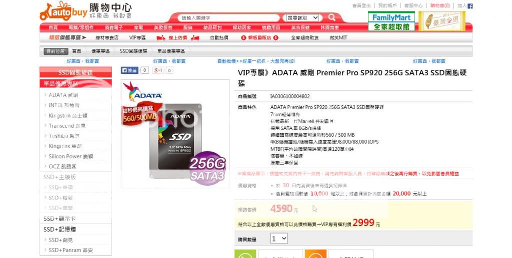 1.品名 : ADATA 威剛 Premier Pro SP920 256G SATA3 SSD固態硬碟