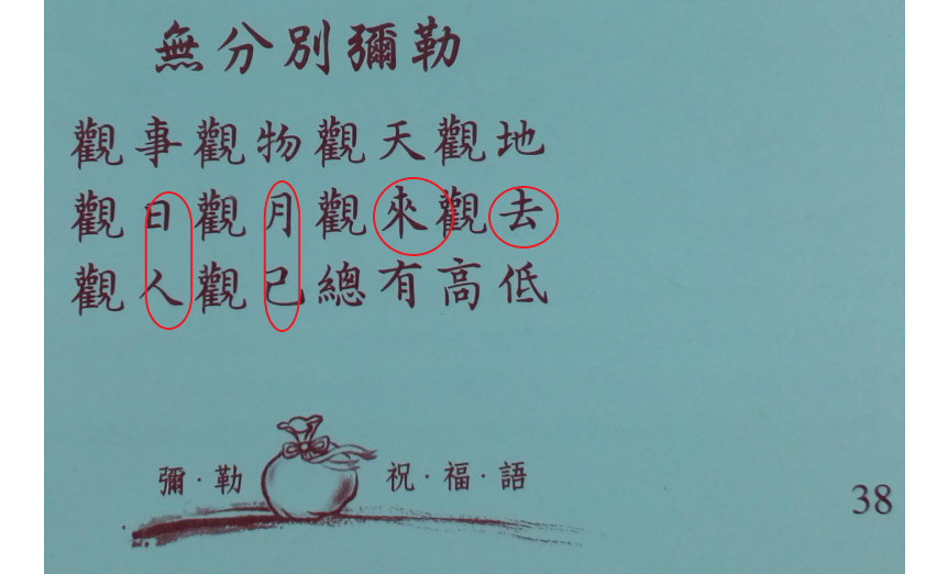無分別彌勒 觀事觀物觀天觀地 觀日觀月觀來觀去 觀人觀己總有高低 小弟資質愚鈍 請問有人知道箇中含意嗎 ![]() |