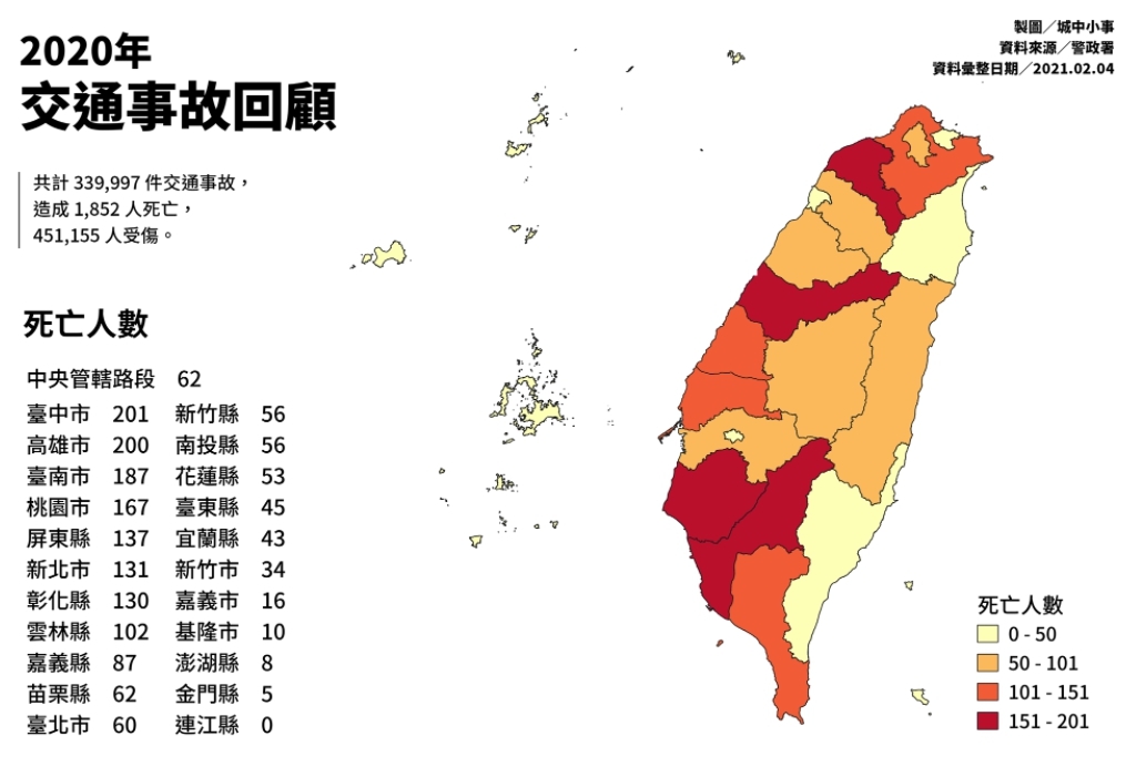 https://youtu.be/ZDzKZ4_QM7A 城中小事 【2020年交通事故回顧】 #台中市 死亡人數超越高雄,成為六都之冠 #高雄市 死亡人數持平,未達成下降3%的目標(受傷人數有達成) 去年一共發生339,997件 #交通事故 造成1,852人死亡,451,155人受傷 整體來看事故量和受傷都降低,但死亡增加 (受限於資料來源,本回顧死亡人數僅列入A1類事故,也就是當場或24小時內死亡) ![]() 歷史資料: 2019年:2,814死 2020年:1,852死 對比一下 ![]()