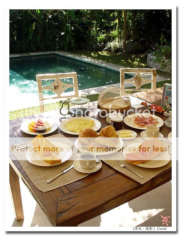 這幾天(06/15)在巴里島的早餐都是在Villa的池畔旁用餐,住Villa是不附餐的,但附贈廚師,所以最近的早中晚都是自己開菜單拿錢請廚師做的,先貼個在池畔旁的早餐和大家分享一下嚕~~