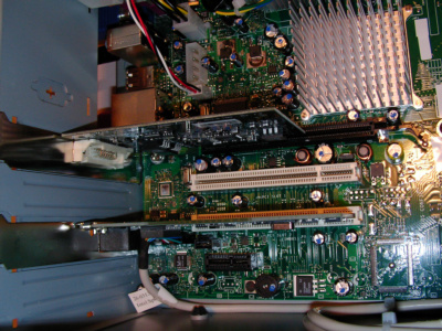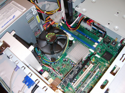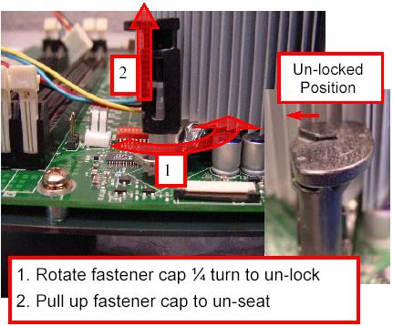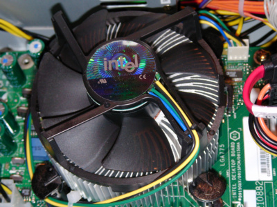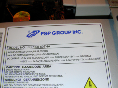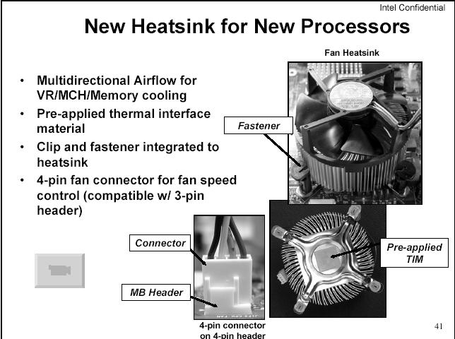 LGA775的CPU.以及915,925晶片組. 這是在會場上展示的其中一台電腦(唯一打開的) 使用的是915G晶片,LGA775 P4 3.4G的CPU.DDR2-533的記憶體. 僑威300W的電源供應器(型號較不同,是較新出來的商品,後面會有圖片),SATA的硬碟.另外有接上一片介面卡(插在PCI EXPRESS X16上),可以做到雙輸出.裡面接到主機版是24Pin的電源接頭. 使用的是僑威300W,型號為FSP300-60THA. 原廠散熱裝置,安裝方式,比起以前是方便多了,只要對準四個角落,直接往下按就好了,拆裝的話,使用一字起子,向左旋90度(使箭頭向散熱裝置),然後分別往上拉起,之後直接把散熱裝置,直接往上提起就可以了. 由圖中可以看到,是設計一個PCI EXPRESS X16,二個PCI介面,一個PCI EXPRESS X1(最下方的插槽).