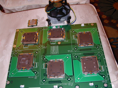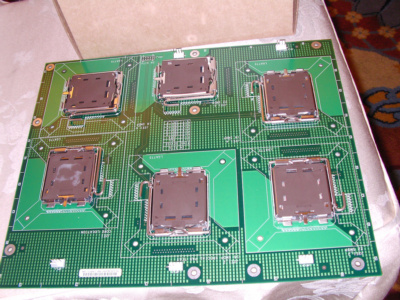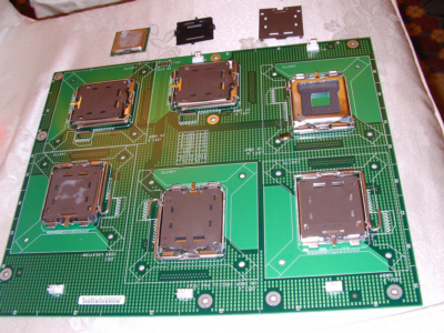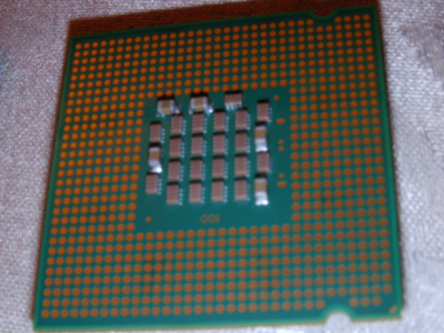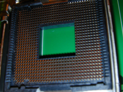 這是在會中,讓參加者練習使用的.當初還沒裝過,心裡真的有點擔心,經過這次練習後,心裡踏實多了. 練習用的SOCKET T腳座 LGA775 CPU(最上方左邊),有一個保護的底座(塑膠製,在最上方中間),最上方右邊的是SOCKET T的保護塑膠片(從練習用的SOCKET T座中拿下) SOCKET T腳座接腳.(這張拍的霧掉了).以後就不會有CPU接腳"斷"等的問題了,以後要擔心的是這裡的問題,使用彎的話,就會造成接觸的問題.(看樣子,以後會因為這個原因而送修主機版的人會蠻多的,而這些都是判定"人為的",以後爭議可能還會很多,會場中,有提到,以後"可能"會參考有人提議,改成圓點按腳型式.目前的SOCKET T的座,都是鴻海做的. LGA775 CPU接腳(應該要算是接觸點).