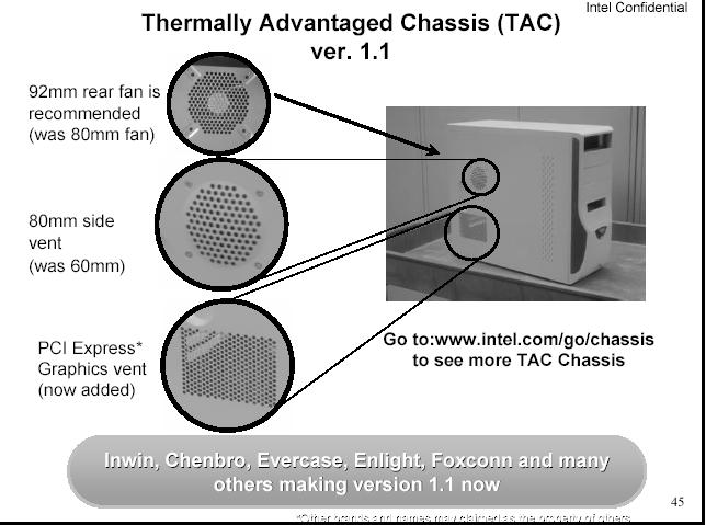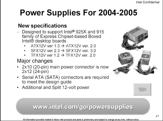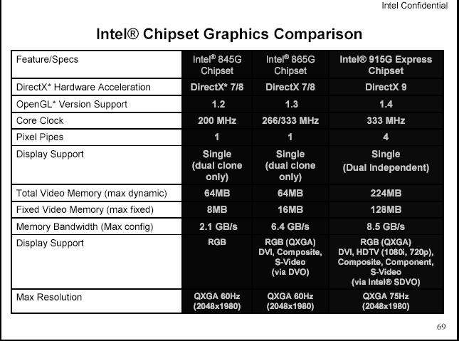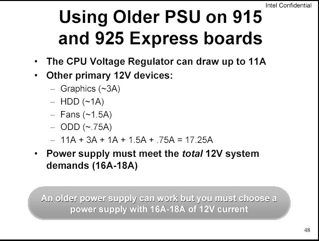 這是目前原廠建議的設計.後方是9X9的風扇設計,側版的部份,新增了一個導風管(可是這對DIY的使用者來說,可能沒那麼剛好,買到的CASE導風管,剛好可以對到MB的CPU上),下方有一個散熱孔,這是計對顯示卡等較熱的裝置設計. 這是電源供應器的一個規格的建議. 以圖中的計算,"建議"就要12A 17.25A以上了(300W的電源供應器)... 如果在加上有高階的顯卡時,建議的基本電源供應器瓦數是400W以上. 這是跟以往INTEL的內建顯卡的比較.比較大的差別是在915G,支援DX9,動態開啟顯示可到224M. 在系統記憶體有多少時,才能開到的動態記憶體. 報告完畢.