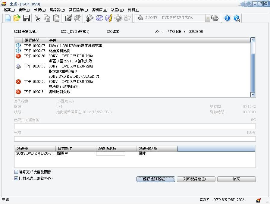 小弟用 NERO 備份資料~~燒錄完成後~~ 比對資料到最後都會出現下面的訊息~~ ![]() 燒入軟體 : NERO 6.6.0.6 作業系統 : WINXP SP2 燒錄機 : SONY DRU-720A JY02 空片 : iomega 4x +R (MCC 002) 超 8X |