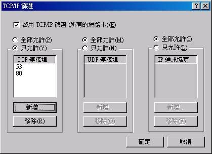 發現如將 "TCP/IP Filter" 裡的 『 啟用 TCP/IP 篩選(所有網路卡)ˋ只允許TCP 連接 Portˋ只允許UDP 連接 Port』,全部勾選。