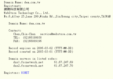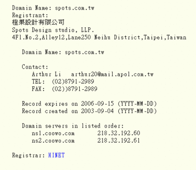 哇,沒繳錢耶! 還是戰國策的主機! 橙果這麼有名還會賒帳嗎? 後來一查,原來是搬到 http://www.dem.com.tw 去了。 這麼知名的工作室會棄網址搬新家真是匪夷所思,在 TWNIC 查 spots.com.tw 網址所有人是橙果沒錯。 現在的 dem.com.tw 是網商註冊的,從 route 看起來使用的是和網的機房。 (戰國策用的是速博的機房,可以確定橙果是真的搬走了) 沒想到橙果這麼知名的工作室竟然連網址都不要了,實在有點誇張。 戰國策呀,你是不是對人家做了什麼? |