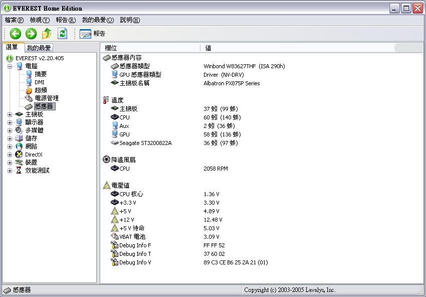 感應器內容: 感應器類型 ITE IT8705F 感應器存取 ISA 290h 溫度: 主機板 36 蚓 (97 蚌) CPU 37 蚓 (99 蚌) Aux 33 蚓 (91 蚌) ST380011A 38 蚓 (100 蚌) HDS722512VLAT80/a 24 蚓 (75 蚌) HDS722512VLAT80/b 37 蚓 (99 蚌) 請問那AUX是指顯示卡的溫度嗎 |