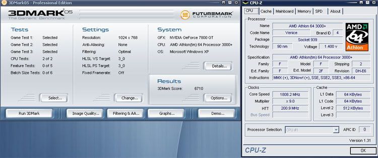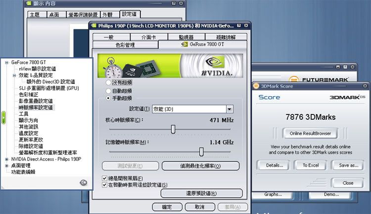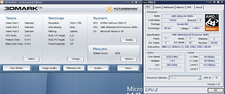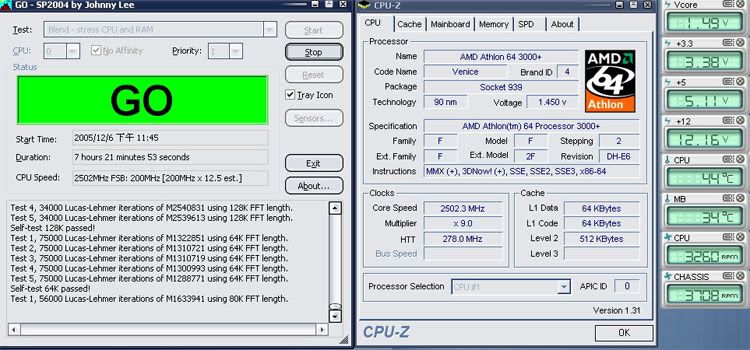最近好不容易空閒下來,就組個K8來玩玩 (自從3年前的Barton賣掉後就沒再玩過AMD),所以心裡還是有些毛毛的。果真,裝機完後就遇到NVRaid當機的問題,搞了二天,什麼方法都試過了,才只好把主機板拿去換,結果一換完就正常了 ,華x品質,果真是…只怪我運氣不好。裝機完小測一下: CPU: AMD Athlon64 3000+ E6 0517 MB: Asus A8N32-SLI Deluxe RAM: G-Skill 512MBX2 DDR600, 2T VGA: 承啟7800GT PCIE HD: Seagate 7200.9 80G x 2 , raid 0 Monitor: Philips 190P6 Power: Zippy 460W Case: Cooler master T05 Mouse: Logitech G7 未超頻下的3DMark05: 6710分 ![]() CPU加壓到1.45V, 280x9= 2.5G, SP2004 7小時通過 ![]() CPU超到2.5G時再跑一次3DMark05, VGA未超:400/1000 : 6925分 ![]() 2.5G + VGA 自動oc 至 471/1140 : 7876分 ![]() 就這樣啦,小弟測得很粗略,不好意思,只給想組新電腦的人參考參考,這樣還有升級的空間,未來換個Ahthlon64x2 再加個二手的7800GT(新品可能已買不到)跑SLI,應該可以撐一段時間吧…