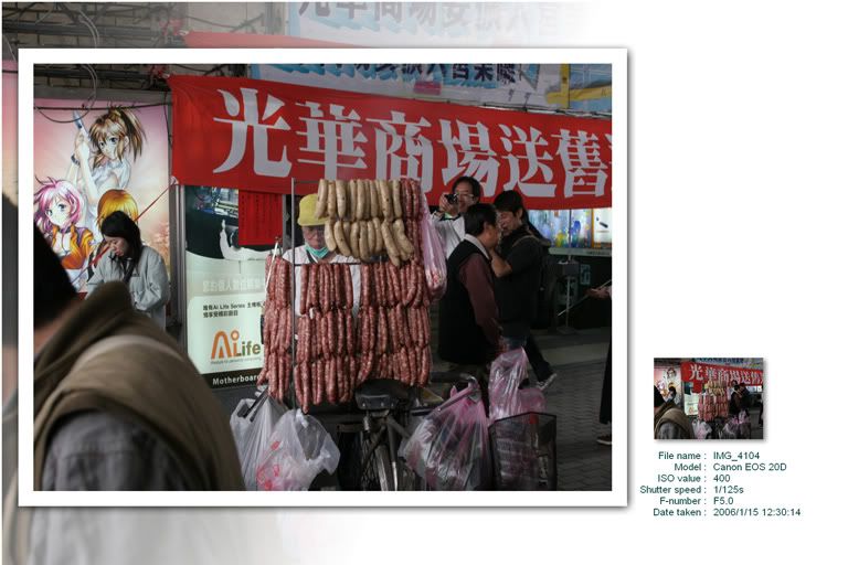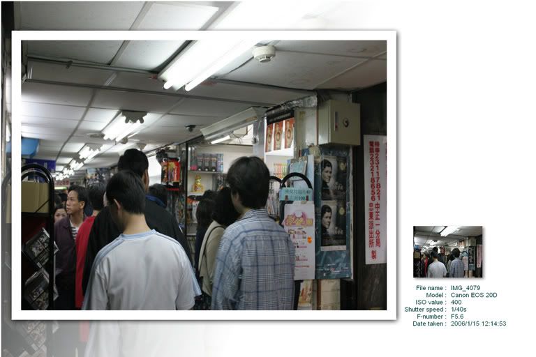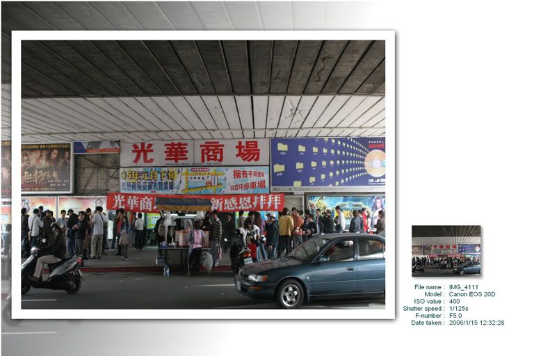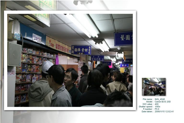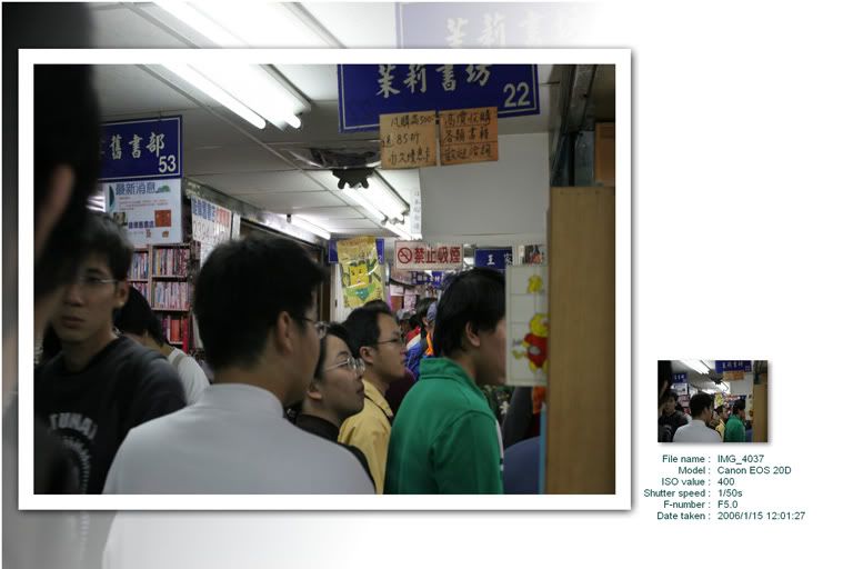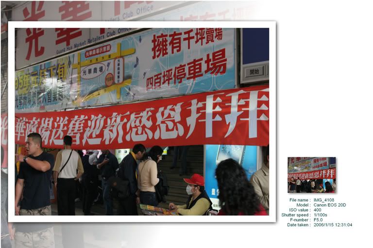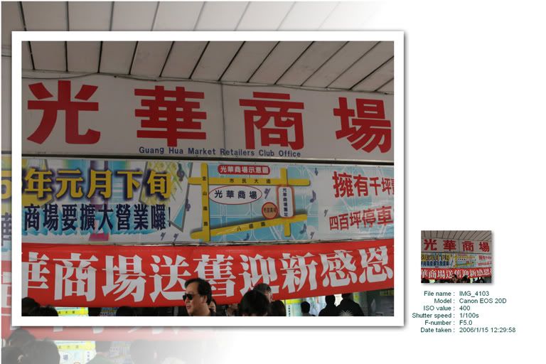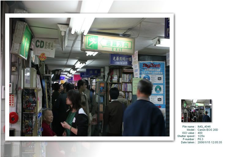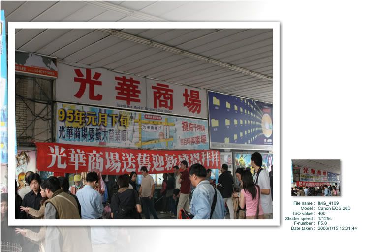 今天大約10點多出門,10:30到,原本想說才早上人應該不會很多 再加上光華好像也是10點才開 沒想到一到了那就發現不是這麼一回事...大家都很早起 我最常逛的地下一樓人多到是我逛光華第一次覺得擠的 另外,今天也是我第一次看到一堆機子在光華商場內內外外穿梭 幸好,早在展場受過磨練再加上厚臉皮 還不至於說停下來取個景拍個照後面的人就不由自主的擠過來 而且由於主要目的是拍照 所以就隨性走走青菜拍拍 好不容易地下一樓走了一圈也拍完了 想說...雖然樓上不常逛,不過還是走走看拍些好了 一上樓又發現我錯了 樓上的人更多,多到只有在出入口附近才有點小空間拿起相機 在走道時大家都一個接一個的移動,若是拿起相機拍照還真是怕k到前面或是對向來的人 拍完出來大約11點半左右了 人潮是有增無減 而且根據昨天新聞的說法是"半價" 似乎只有在舊書攤有看見 想到那些舊書攤的阿背或是賣影片,體育用品的店家 還真不知道他們是否會搬到新家 總之~ 再見了,光華商場 ![]() |