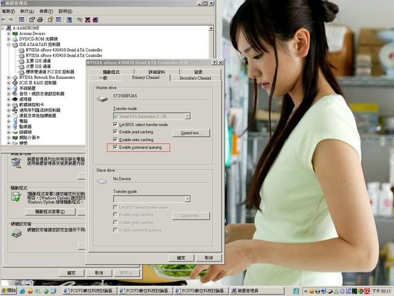 打開硬體管理員,右鑑點選SATA控制器內容, 看驅動程式裡面有沒有NCQ選項。