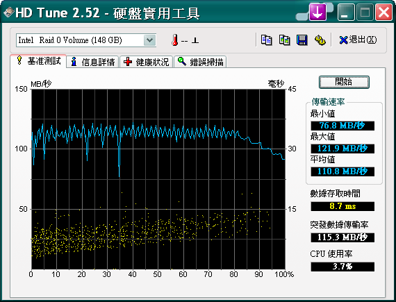 雖然遭受一些小問題.. 但目前大致上都解決了 關於ICH8R的部分.. 今日丟上關於他的傳輸效率測試.. 請了兩顆小暴龍作RAID測試.. 殘念...ICH8 Series拒絕支援TCQ.. 所以沒法開.. 除非連到JMicron的Port.. 可是這等於要我重灌阿阿阿阿阿阿阿... ![]() RAID 0 System(Block Size切成128kb) 先看一下HD Tune Test: 再來是HD Tach: 等我想到什麼再測吧..! |