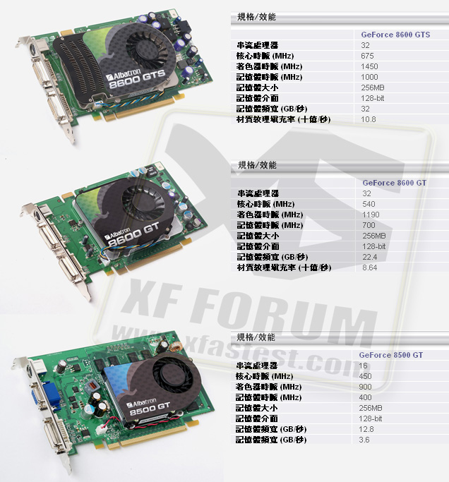 顯示卡龍頭 NVIDIA 推出的首款支援 DX10的高階繪圖處理晶片 G80,繪圖核心高達384BIT,強悍的效能及 支援DX10的引擊,讓遊戲不僅畫面漂亮、性能顯著,NVIDIA 的 8800GTX 8800GTS 讓對手幾乎無法招架。 訂定了高階的地位後,NVIDIA 也搶功中階市場 於這星期 連著推出了三款128位元的繪圖處理器。 分別為核心代號 G86-300的 8500GT 、代號為 G84-300的 8600GT及 代號 G84-400的 8600GTS。 三款處理器,同樣採用 80奈米 的工藝技術,核心為台積電代工。 中階的 8600GTS / 8600GT 搭配 256MB 的 DDR3,入門級的 8500GT 則搭配 256MB的 DDR2 WINDOWS VISTA 加上 全系列產品線的 NVIDIA 繪圖卡,DX10 成為主流的時機已經到來了。 國內的繪圖卡廠 青雲科技 ( Albatron ) 於這周也推出三款 搭載 NVIDIA 80奈米的繪圖卡 8600GTS 8600GT 8500GT ,支援 16X倍的 PCI EXPRESS 匯流排 ,也支援 NVIDIA 的 SLI 雙卡技術。 ![]() 三款繪圖卡的規格比較 ![]() 本次要測試的為 青雲 ( Albatron ) 8500GT 256MB 核心代號為 G86-300 不在區分渲染管線及頂點著色單位,全新的渲染架構設計 , 16個 UNIFIED SHADER(串流處理器)運行時脈為 900MHZ 一個 1TPCs ,一個ROPS (像素輸出處理單位),80奈米工藝,核心擁有 2.1億個電晶體,最大耗電 40 瓦 支援 DirectX 10 & Shader Model 4.0 , 2D 的PURE VIDEO 可以播放 1080P 的 MPEG-2 和WMV HD 高畫質的HDTV 支援 H.264 的視訊硬體加速解碼。 精緻的彩盒,加入碳纖維的設計元素,沒仔細看,還以為是某個 F1 賽車廠的禮品 ![]() 原來是 擁有GT 渦輪引擊的 青雲 8500GT ![]() 入門級的顯卡也作的很漂亮,擁有一個 DVI 一個 D-SUB 和 HDTV的輸出單位 ![]() ![]() ![]() 拆開引擊蓋 渦輪風扇是 MAGIC 代工的 12V 0.19A ,MADE IN CHINA ![]() 和核心接觸的是鋁底 鋁鰭片,當然對最大耗電只有 40瓦 的8500GT 已經夠用了 ![]() 8500GT 的繪圖核心為 G86-300,A2制程,80奈米 265位元,2007年第八週,為台積電代工生產。 核心預設時脈為 450MHZ。 ![]() 記憶體方面,採用韓國 海力士 2.5ns DDR2 ,每顆IC 32MB,總共256MB,2006年第44週生產。 ![]() [hr] 青雲 8500GT 預設時脈為459/ GDDR2-800 引用:
