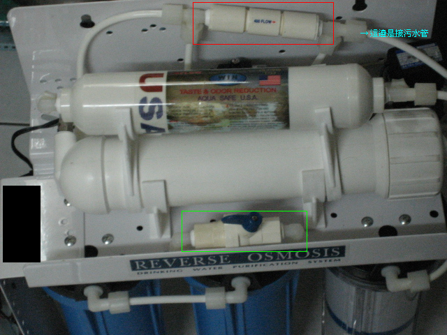 紅色的是限壓力閥也就是廢水比例(廢水比)(業界內的稱呼) 是利用控制廢水排放端的壓力,減少清洗RO膜的用水量,簡單來說就是一個省水裝置 但相對的,使用此裝置也會減低RO膜的清洗效能 所以才設計綠色的那個開關,讓使用者選擇是否開啟省水模式 關:以省水模式清洗,開:以一般的模式清洗