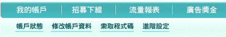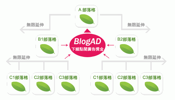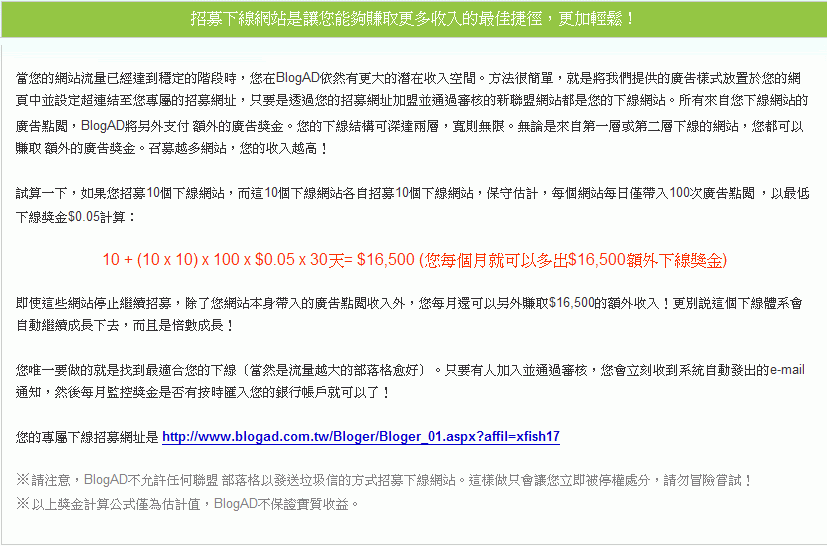 = =a 我沒有不寫出來啊 只是昨天發文很晚了 想說今天再來繼續介紹的 結果... 算了 本來就只是想介紹給大家知道而已 就跟andytn說的一樣 BlogAD的收益有兩種,一個是自己的****被點 還有一個就是下線的****被點 後面的參數將會決定當誰的下線 他的收益是類似像這樣的方式 ![]() 只要你有BlogAD的帳號後 登入管理介面看到有一個招募下線 按進去 ![]() 就會看到這個畫面 ![]() 將畫面中的連結 放到你的BLOG裡面推廣 只要有人按那個連結 並且申請BlogAD成功 他就是你的下線 以上∼謝謝收看 以上教學同步發表於我的BLOG |