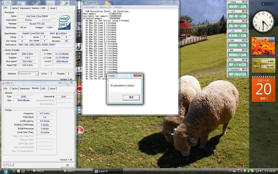 當時是 E6600 + ASUS P5B-E PLUS + DDR2 800 1G*2,測過最穩的的組合是 350*9,超過 350 就無法開機了 不過用 TAT 燒機時溫度達 70 度.... 真怕會爆機也可以用 400*8 不過不穩定有時會當機 以上是原廠風扇 |