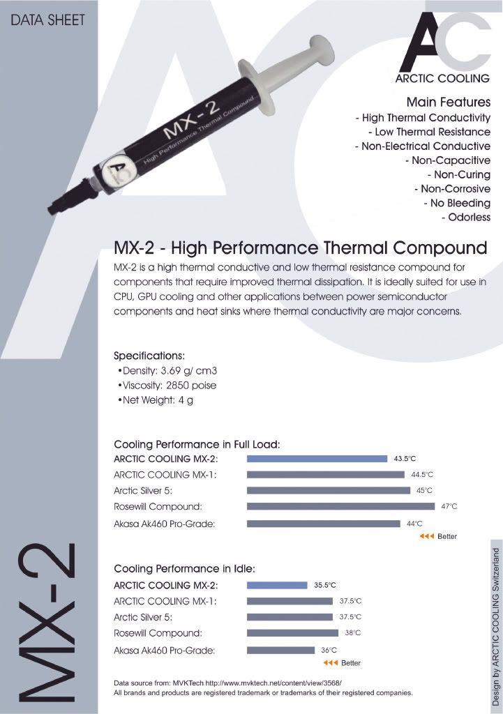 AC方面剛剛發出電子新聞稿了 ------------------------------- Dear Media Partner, ARCTIC COOLING has introduced the MX-2 – The 2nd generation of the High Performance Thermal Compound for the Enthusiast. Enclosed please find the Press Release and the Photo: * Product webpage(原廠介紹網頁): http://www.arctic-cooling.com/further_prod2.php?idx=140 * Data sheet(PDF傳單 英文版): http://www.arctic-cooling.com/arcti..._sheet_MX-2.pdf * High resolution photo(大圖!): http://www.arctic-cooling.com/pics/mx2_00h.jpg and http://www.arctic-cooling.com/pics/mx2_01h.jpg. Review request is welcome. Please contact us for further arrangement. 另附上中文版新聞稿以便參巧, 謝謝! Best Regards ___________________________________________________________ ARCTIC COOLING Switzerland ------------------------------- 中文版新聞稿 ![]() 而MVKTech的評測也可以觀看了(需註冊) 網址=http://www.mvktech.net/content/view/3568/ 現在只開通到第一頁就是了 至於本人測試 明天早上應該就會貼出成果了 請各位在等一下嚕~