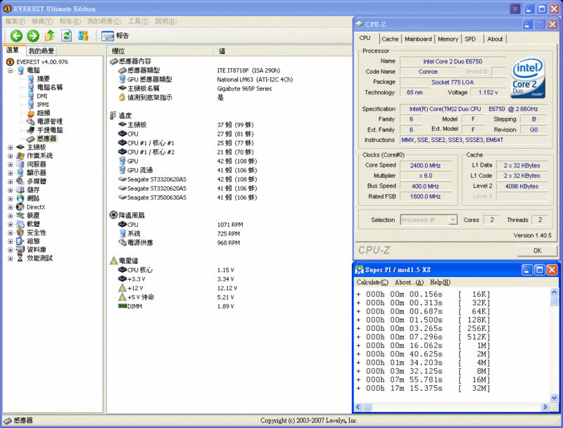 mb:技家合版 g33-ds3r f4 原廠風散∼蓋測版∼沒冷氣bios只改外頻400∼其他都預設值 溫度沒你高∼時脈還比你高一點點 有一點很奇怪∼就是cpuz跟技嘉的電壓偵測不一樣??不支要到看哪一個