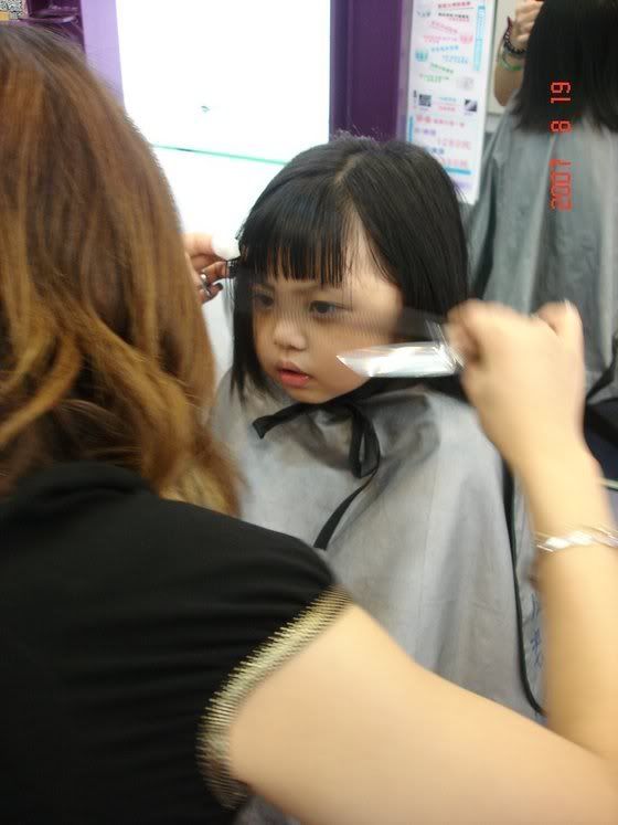 昨天周日是我三歲大的外甥女第一次剪髮,是家裡的一大事.老妹特別拍照留念.