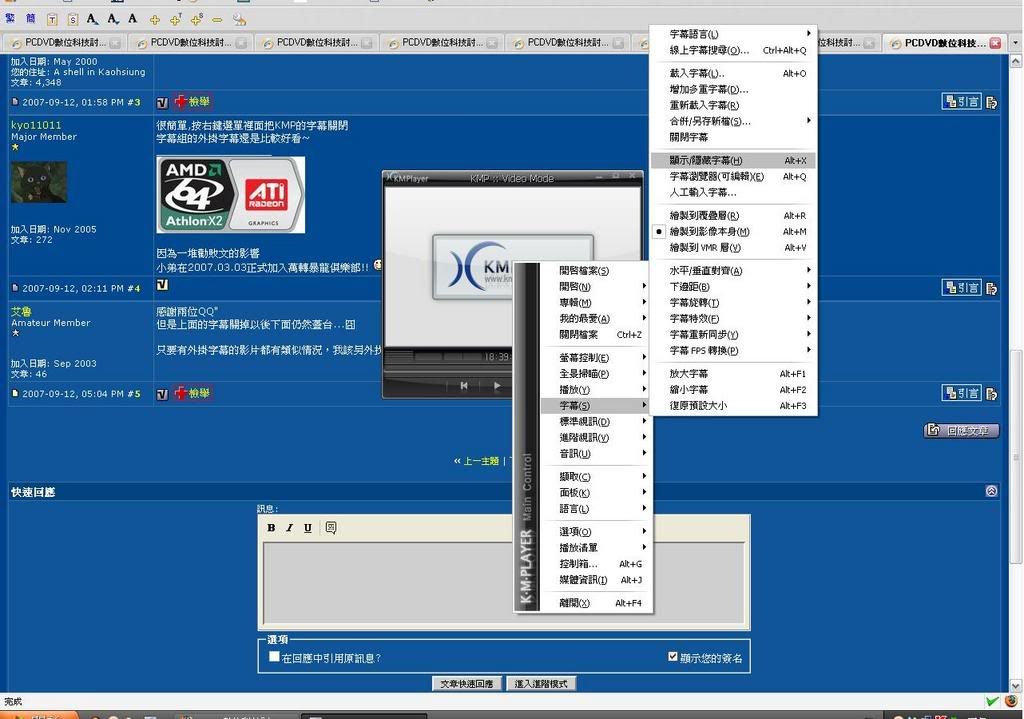 我想你是誤會我的意思...不是把外掛字幕關掉喔!! 是按這裡啦~~ http://i221.photobucket.com/albums/...KMPprintscr.jpg 嫌麻煩的,就按快捷鍵(ALT+X),好啦...我承認我很懶 ![]() 此文章於 2007-09-12 07:07 PM 被 kyo11011 編輯. |